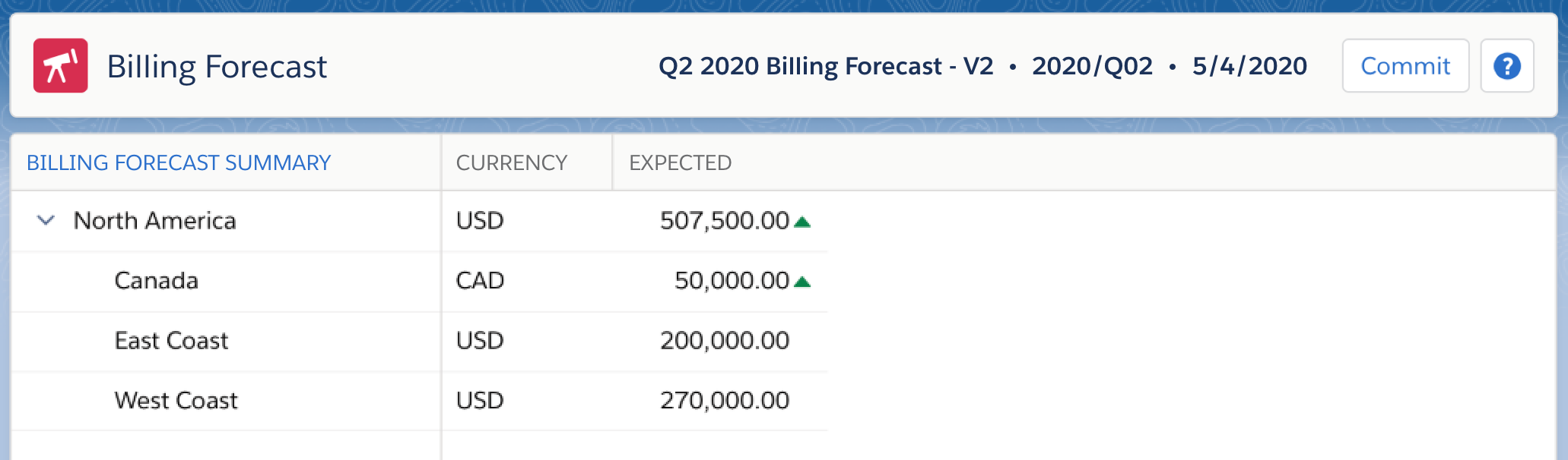 The value for North America is changed to 507,500 USD following the override and the icon indicates that the adjusted value is greater than the original value returned by the billing forecast calculation.