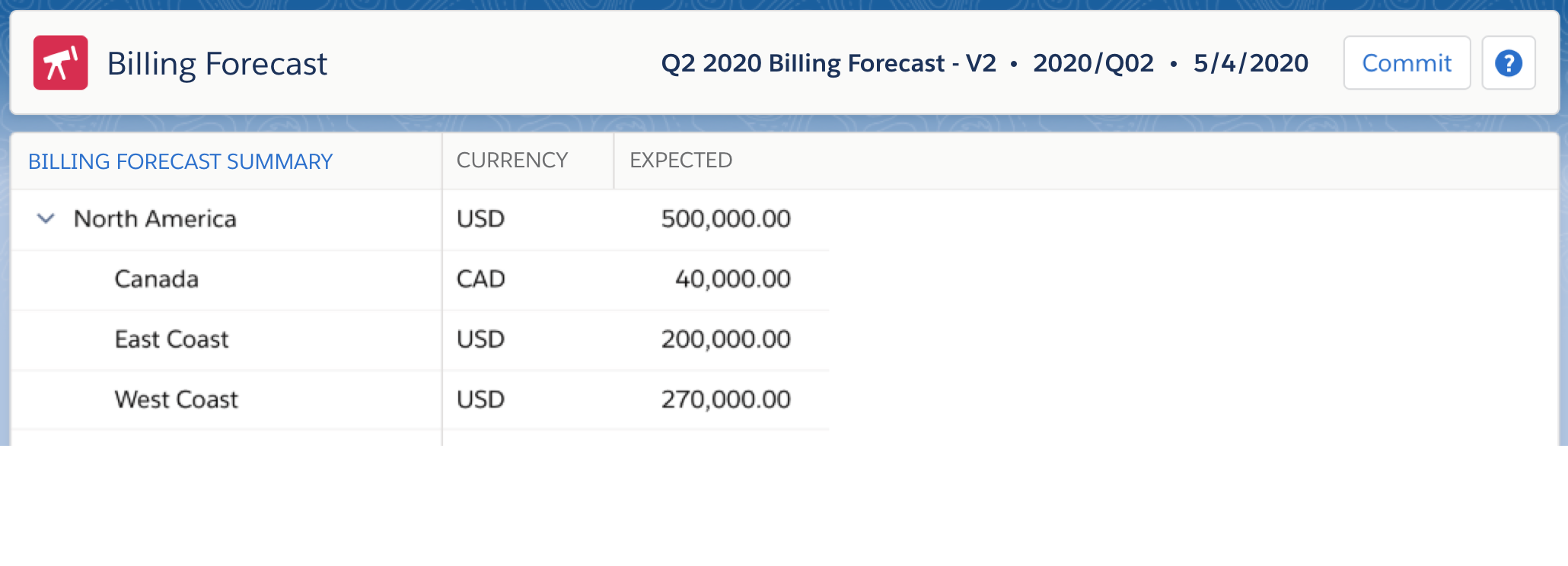 The values on the Billing Forecast are displayed in the currency of the corresponding RPG. If multiple currencies are displayed on the Billing Forecast, override calculations use the exchange rate that was current on the Created Date of the forecast calculation.