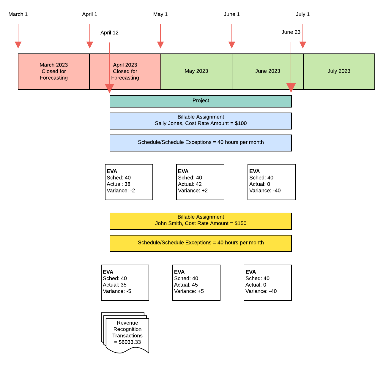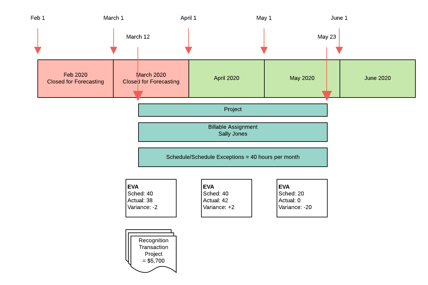 A revenue forecast record is created for each month for projects and milestones whose recognition method is set as % Complete. This record stores the values from EVAs, unheld resource requests, and timecards for use in Revenue Forecasting.