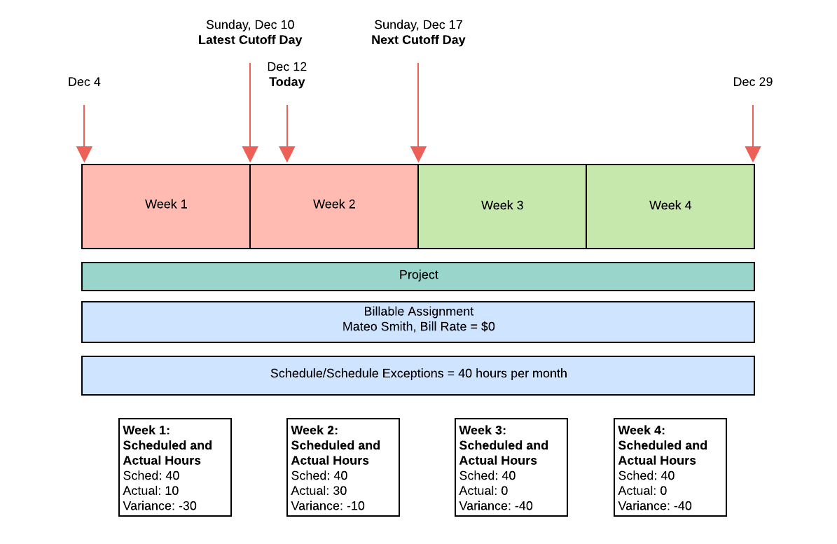 - Exclude Actuals After Cutoff Day (this means Revenue Forecasting excludes scheduled hours that fall after Sunday, 10 December).