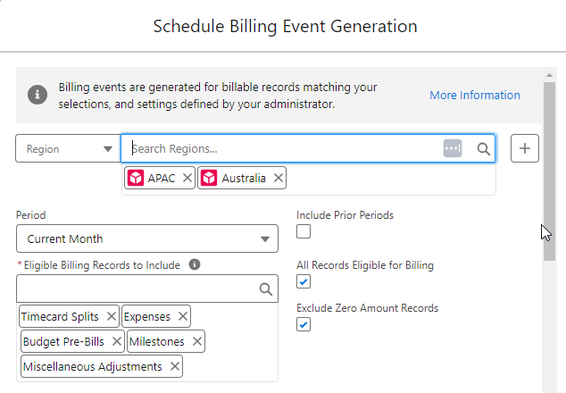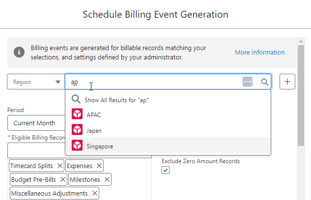 Example 1: Shows the implementation of the multi-select lookup functionality in the Schedule Billing Event Generation window.