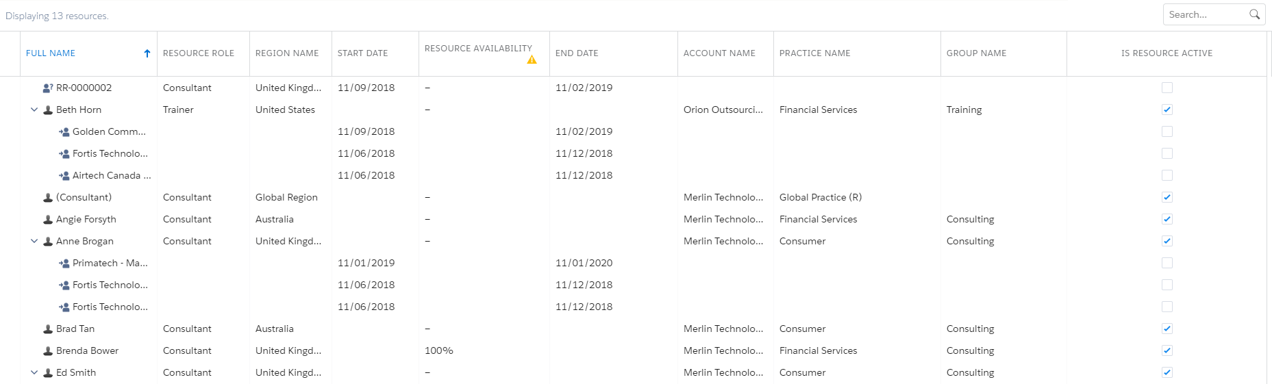 | Resources List | Displays all resources in your organization A deployment of the Salesforce/Certinia applications with a defined set of licensed users. Your organization (org) includes all of your data and applications, and is separate from all other orgs. together with their profile photos if configured by your administrator. Click to expand or contract the resource's assignments and held resource requests A resource request with a status of “held” and a schedule. The Resource field is populated.. Double-click the resource name to view the edit assignments panel. |