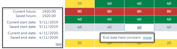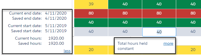 End date held constant When you adjust hours, the end date does not change and the total hours is adjusted over the remaining working days.