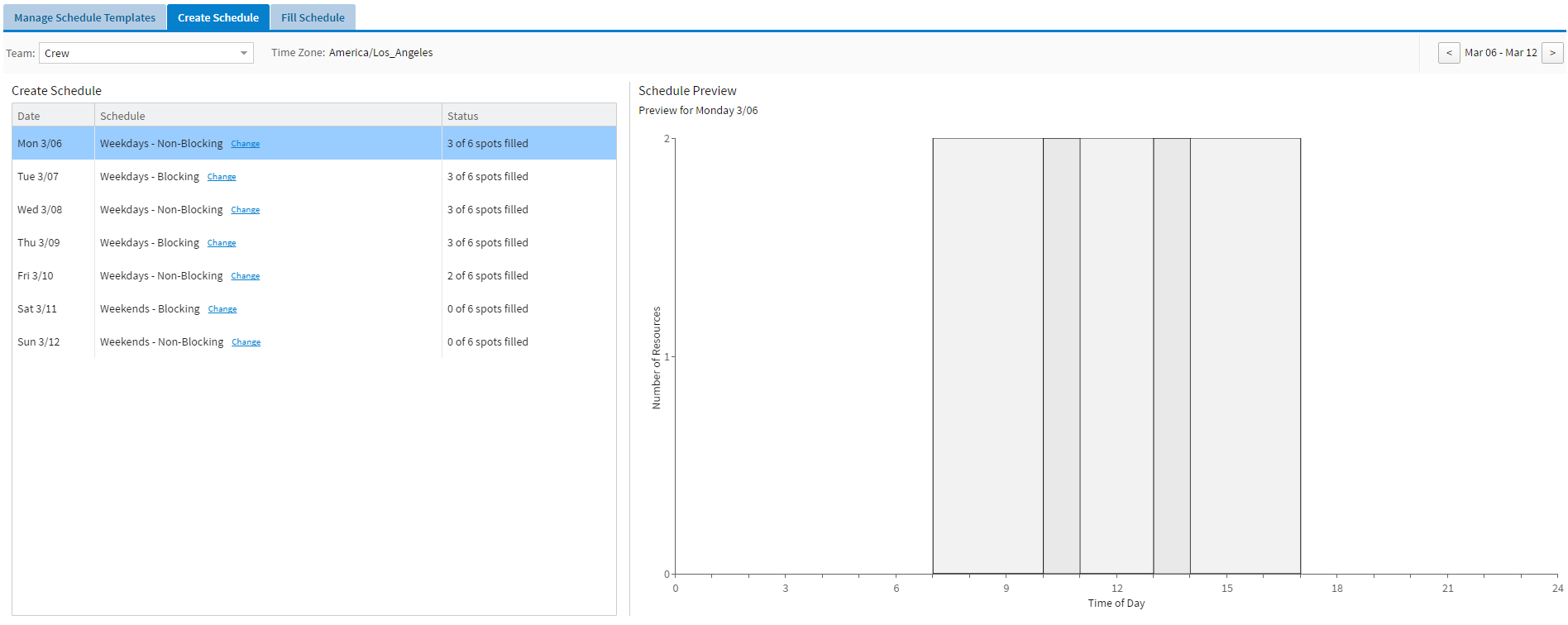 From the Create Schedule tab, you can create team schedules, see an overview of the number of spots filled for each daily schedule, and see a graphic preview of the schedule associated with the selected template.