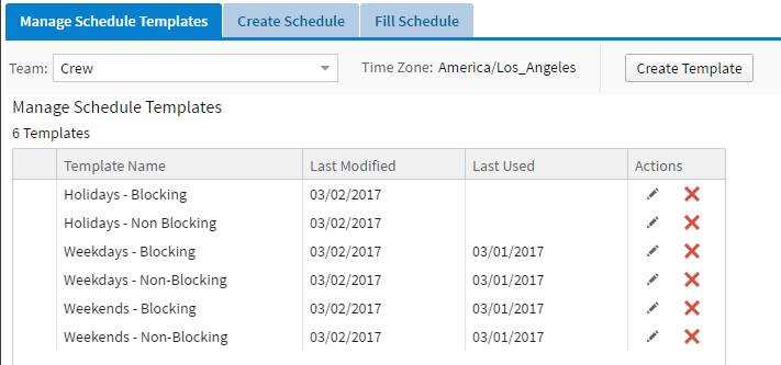 From the Manage Schedule Templates tab, you can view a list of templates, the last modified date for each template, and the last date each template was used. From this tab, you can also: