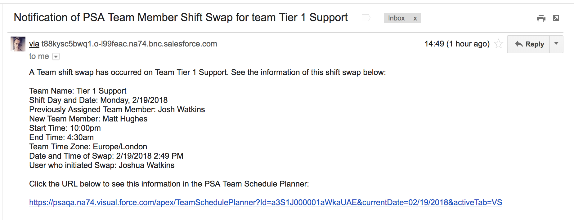 A Team shift swap has occurred on Team <Team_Name>. See the information of this shift swap below: <br/><br/> Team Name: <Team_Name><br/> Shift Day and Date: <Shift_Day_Date><br/> Previously Assigned Team Member: <Previously_Assigned><br/> New Team Member: <Newly_Assigned><br/> Start Time: <Start_Time> <br/> End Time: <End_Time> <br/> Team Time Zone: <Team_Time_Zone><br/> Date and Time of Swap: <Swap_DateTime><br/> User who initiated Swap: <Initiated_By><br/><br/> Click the URL below to see this information in the PSA Team Schedule Planner:<br/><br/> <URL_Swap>