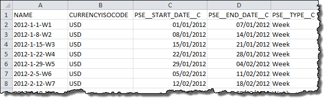 Comma Separated Values file.In this example several time periods of the type Week are created.