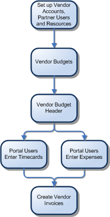 The following diagram shows a basic example of a way in which Vendor Invoicing in PSA can be used. Click a box on the diagram to display a corresponding topic. For information about the way in which PSA components fit together, see PSA Overview.