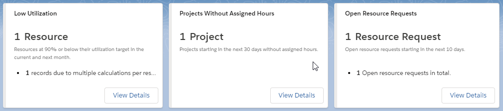 Alerts provide you with information to highlight important details about your assignments, resources, resource requests, and projects. To display a list of detailed records specific to each alert, click View Details.