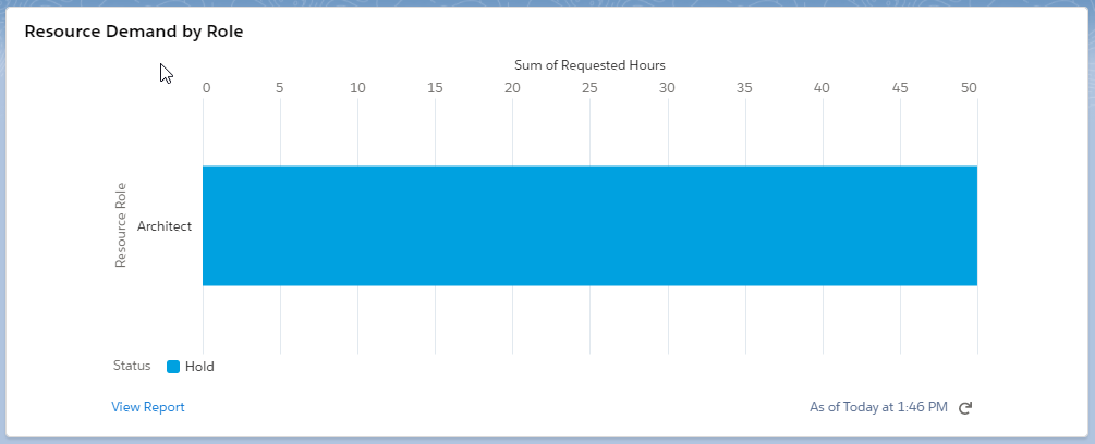 The Resource Management Workspace Report Chart displays a Resource Demand by Role report, summarizing the total number of hours of all unassigned resource requests, per all resource roles. Resource requests with the status of "Assigned" and "Canceled" are excluded.