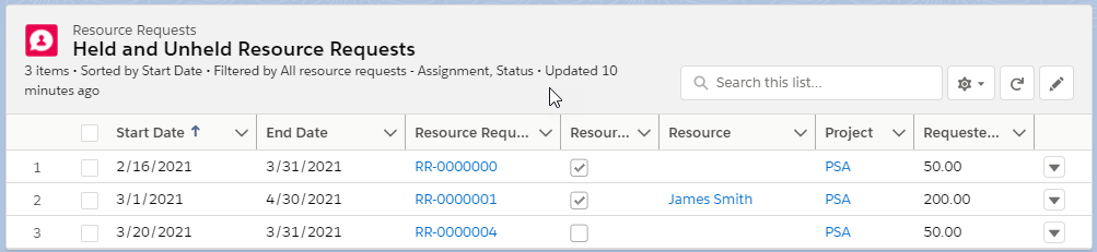 The Resource Requests List View displays a list of held and unheld resource requests with the status of not "Canceled" and without assignments.