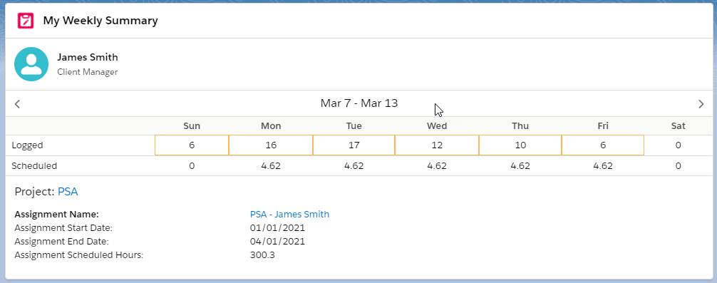 The My Weekly Summary component provides a weekly view of status for all your associated projects, assignments, and project task assignments.