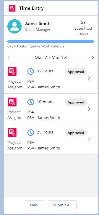 Time Entry enables you to quickly access related content. To display a list of detailed time entries specific to each timecard, click an individual timecard.