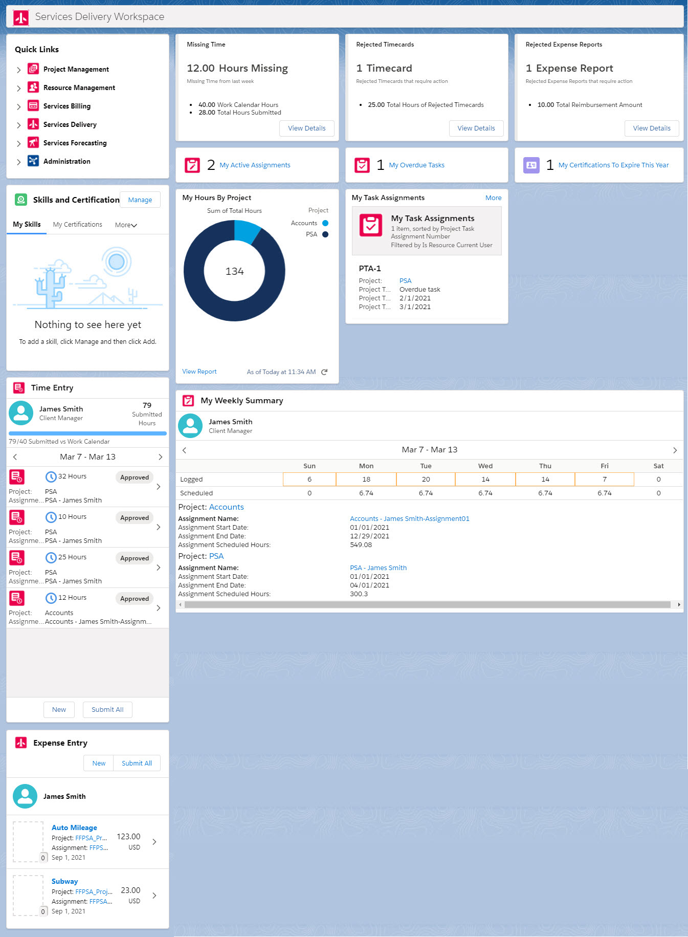 The Services Delivery workspace acts as a starting point for consultants, resources or any member of your organization who submits timecards and creates expense reports. The Services Delivery workspace also provides capabilities and components relating to skills and certifications, time variances, project task assignments and assignments.