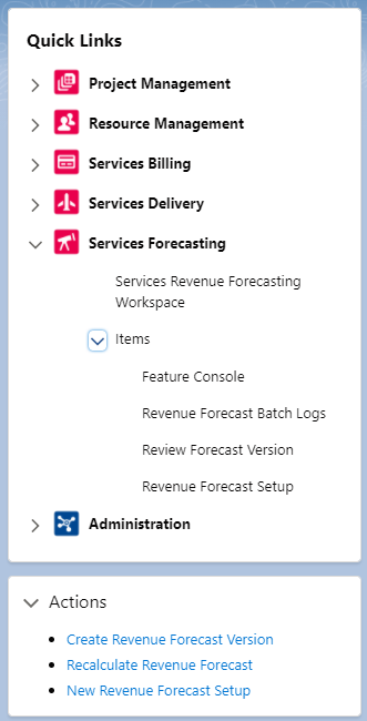 The Services Revenue Forecasting links enable you to navigate to the most frequently accessed pages that are relevant to your role.