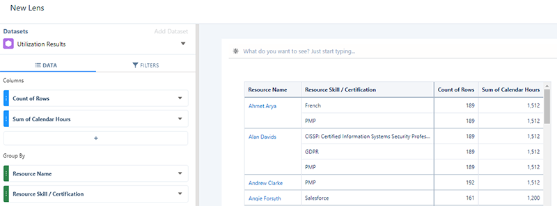 This repetition occurs when grouping by Resource Skill / Certification using data derived from Project Reporting and Utilization Results datasets. For example, see the grouping shown in the lens derived from the Utilization Results dataset below.