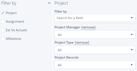 - Click the Filter By drop-down and choose the fields you want to filter on. For example, if the source object is Project, you might want to filter on fields such as Project Manager and Project Type. On the Recognize Revenue page, you can select fields either by picking them from the drop-down list or by typing into the box. The characters you type are matched against both field labels and API names, with the list of matching fields updating as you type. On the Forecast Revenue page, you must select fields by picking them from the drop-down list because typing into the box is not supported.