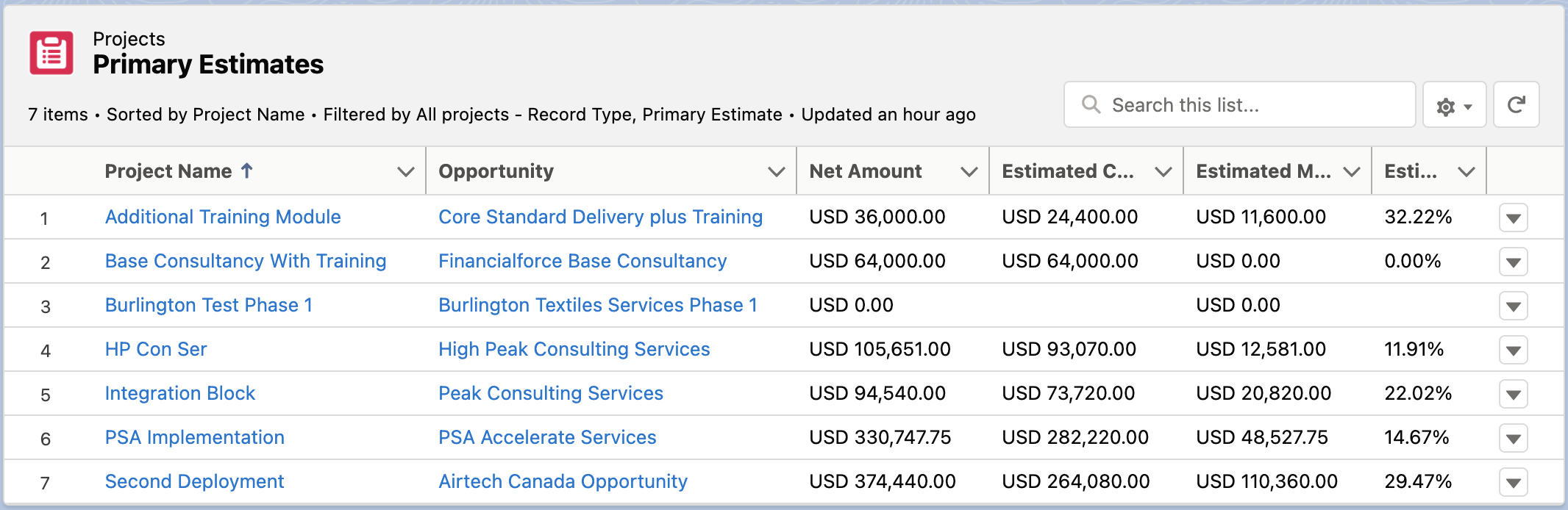 The Primary Estimates list view displays a list of estimates with the Primary Estimate checkbox selected.