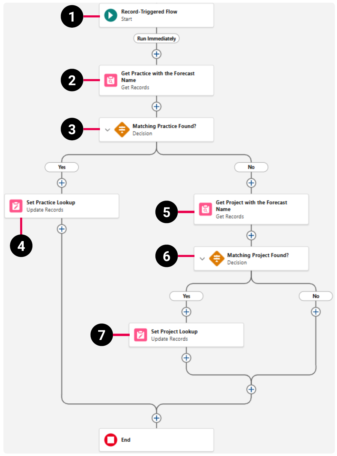 This sample flow is a record-triggered flow that tries to find a practice that has the same name as the forecast. If found, the practice is used to populate the Practice lookup field. Otherwise, the flow tries to find a project that has the same name as the forecast. If found, the project is used to populate the Project lookup field on the forecast.