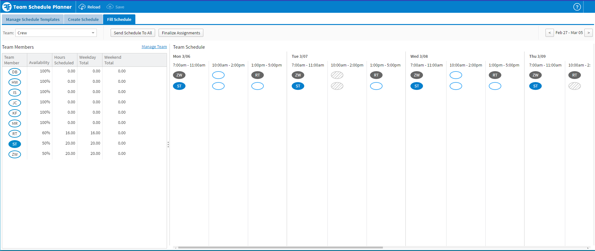 From the Fill Schedule tab, you can review information on both individual team members and the team schedule.