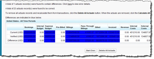 If the Actuals Verifier found differences between the transactions and the actuals records, click the link to review them. Differences are highlighted like this.