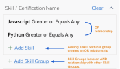 To add a single skill, click Add Skill. If you want to add more skills that have an Or relationship between each other, click Add Skill again. For example, if you are searching for resources with either Javascript or Python programming skills. Clicking Add Skill to include additional skills always defines an Or relationship between skills within a Skill Group.