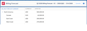 The values on the Billing Forecast are displayed in the currency of the corresponding RPG. If multiple currencies are displayed on the Billing Forecast, override calculations use the exchange rate that was current on the Created Date of the forecast calculation.