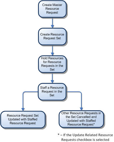 A resource request set is a group of resource requests. If your administrator has configured PSA to use resource request sets, you can use a resource request set to hold several resources for a particular task. When one of the resource requests in the resource request set is staffed, the status of the other resource requests in that set are set to Cancelled.