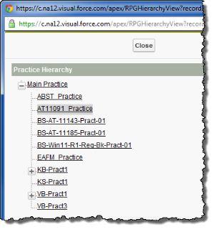 You can view the hierarchy of regions, practices or groups in the Region, Practice or Group Hierarchy popup:
